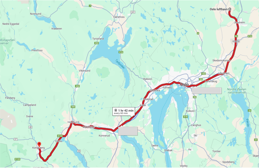 Kongsberg is located north of Oslo, 1 hour 45 minutes by Train (straight/ with connections routes) and 5 hours by bus (1 change at Oslo bus terminal)
